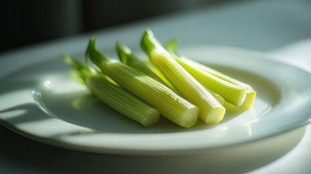 A close-up of fresh baby corn on a white plate, with soft shadows enhancing texture.