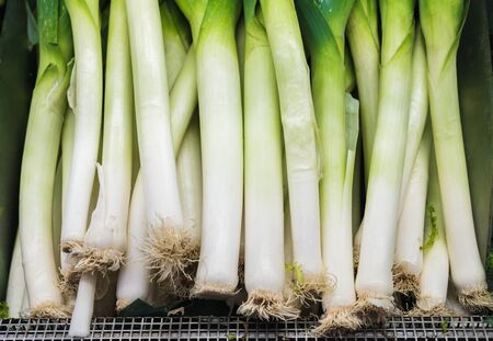 Bunch of fresh organic leek on the shelve in a market. Vegetable