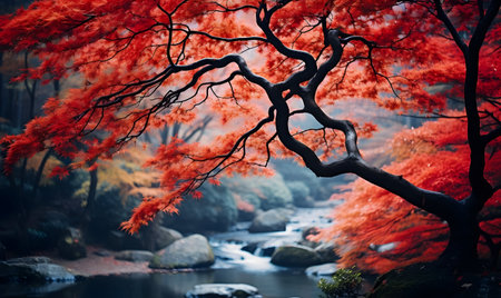 A vibrant red maple tree stands proudly against a majestic mountain backdrop, its fiery foliage ablaze in the autumnal glow The picturesque scene captures the breathtaking beauty of nature in its most vibrant season, creating a captivating image that evokes tranquility and wonder AI Generative