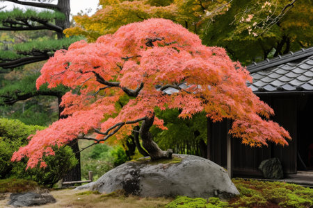Striking japanese maple tree in full autumn colors stands against a traditional backdrop