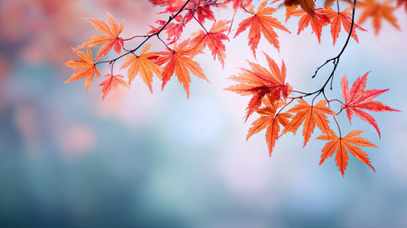 This image features close-up view of vibrant red and orange maple leaves on a branch. The leaves display a rich texture and are set against a soft, out-of-focus background in shades of blue and white. This composition would be suitable for various commercial uses, including website backgrounds and print media.
