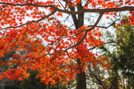 Red maple leaves or fall foliage with branches in colorful autumn season in Kyoto City, Kansai. Trees in Japan. Nature landscape background.