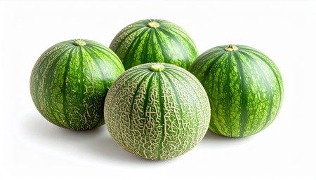 Four whole green melons with textured rind and striped pattern displayed on a white background.