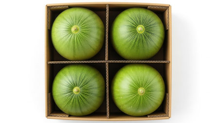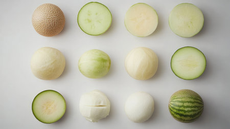 A stunning arrangement of fresh melons and cucumbers showcasing their textures and colors on a clean white background, perfect for food photography.