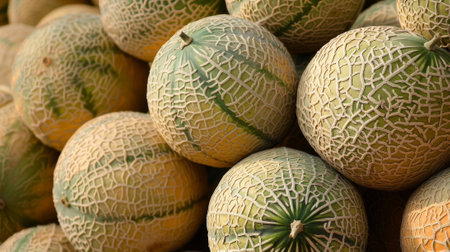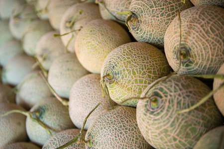 Cantaloupe fruit, focus on the pile of fresh Cantaloupe fruit