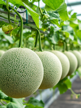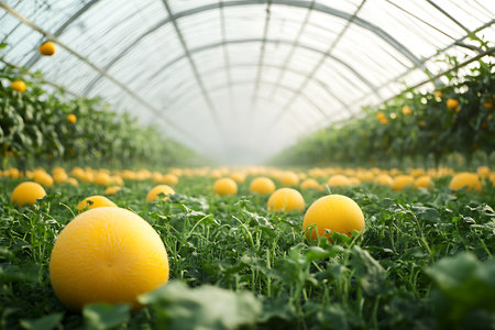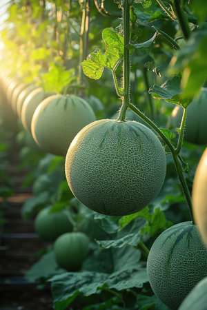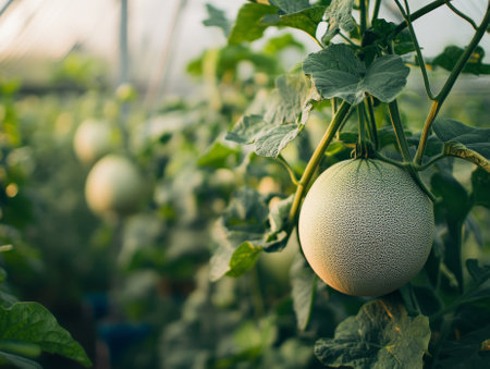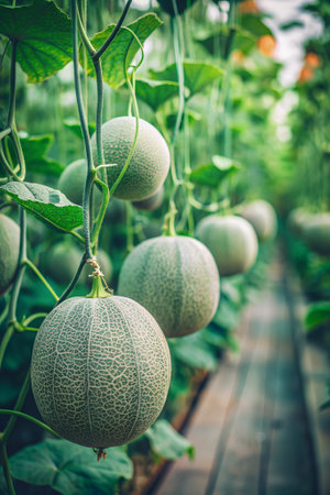 Melons growing in a greenhouse, soft natural light filtering through