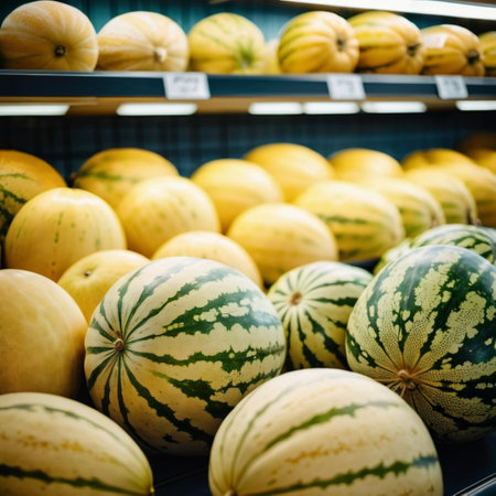 Variety of fresh yellow melons and green watermelons are arranged on supermarket counter, showcasing colors and inviting freshness. Shoppers can easily spot these delicious fruits. Generative AI.