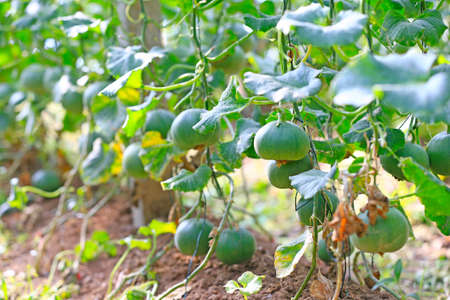Fresh melon or green melon or cantaloupe melon plants growing in greenhouse