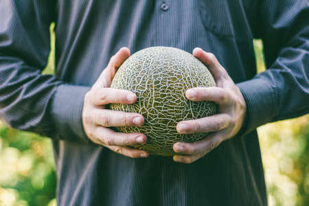the man is holding a ripe melon