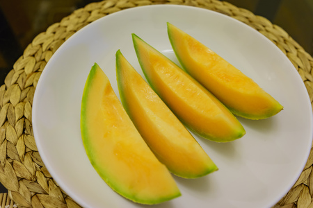 Ripe fresh cantaloupe slices on white plate
