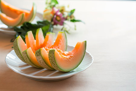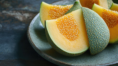 Enjoy the vibrant colors and textures of freshly sliced melon on a rustic plate. Perfect for summer recipes or healthy lifestyle imagery.