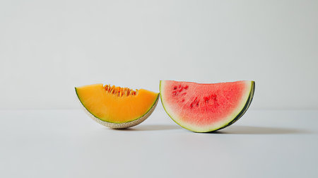 A halved cantaloupe and a slice of watermelon arranged neatly on a clean white surface