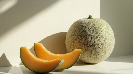 Slices of ripe melon on a wooden cutting board with soft shadows playing across a light surface