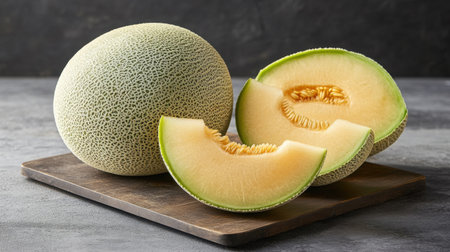 This beautiful image features fresh organic cantaloupe melon slices on a wooden cutting board, showcasing vibrant textures and colors ideal for healthy summer recipes.