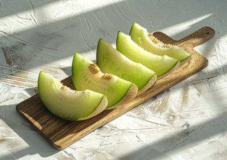 Fresh green melon slices arranged on a wooden cutting board beside soft shadows