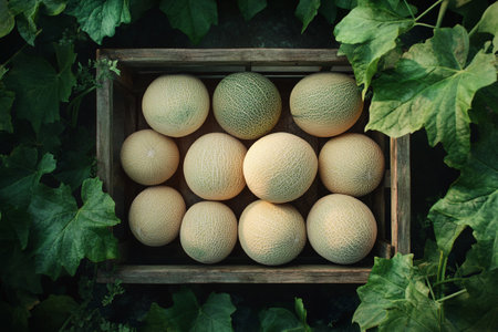 Cantaloupe melons in wooden box on green leaves background