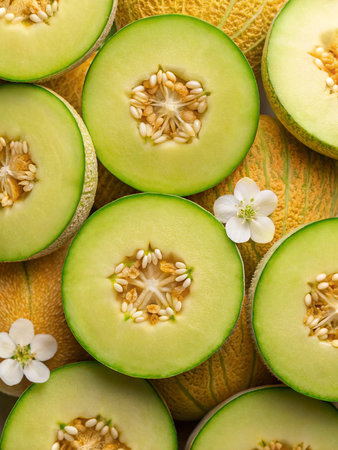 Close-up of melon slices with seeds and flowers. Top view.