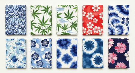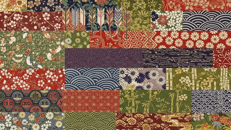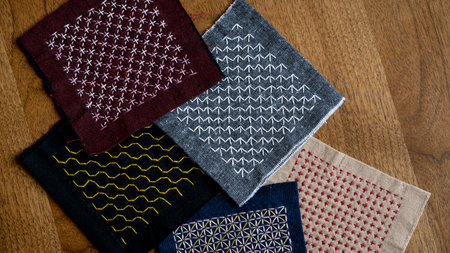 Japanese embroidery patterns on colorful clothes wooden background. Sashiko Embrodiery.