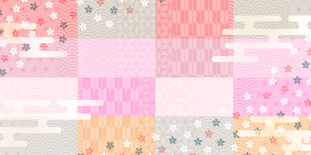 Beautiful japanese seamless pattern set with fans, clouds, waves, bonsai, sakura flower Vector seamless asian retro texture.