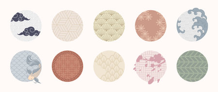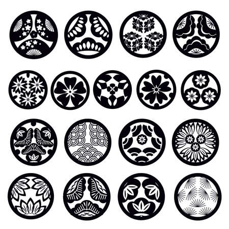 Japanese tradition circle set with various geometric and nature patterns. Decorative oriental elements for Asian designs, packaging or textiles projects. Classic motifs in modern circular format.