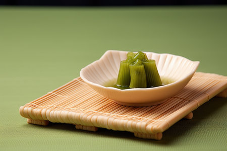 a minimalist shot of a ceramic wasabi dish on a bamboo mat, created with generative ai