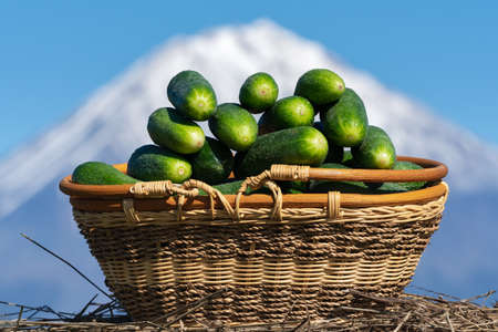 Wicker basket with freshly picked organic cucumbers on background of volcano cone and blue sky. Summer and freshly healthy eco vegetables on agricultural farm in sunny weather.