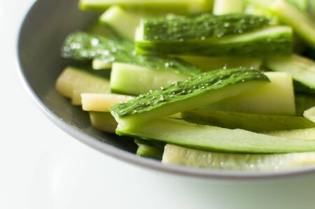 sliced cucumber on plate with sauce in restaurant, stock photo