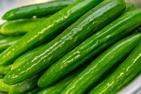 Green cucumbers on the counter of the store. Selective focus.