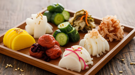 A neatly arranged wooden tray filled with assorted Japanese pickles (tsukemono), including daikon, cucumber, and plums (umeboshi). The colorful and fermented side dishes represent traditional Japanese cuisine.