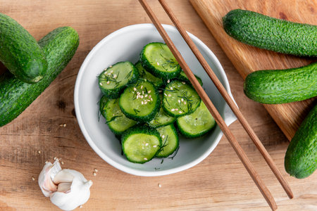 Sunomono, Japanese cucumber salad. Sliced cucumbers with asian dressing of soy sauce, rice vinegar, sesame oil, sugar and dill in white bowl on wooden table.