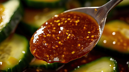 This close-up image features a spoonful of sweet and spicy sauce, glistening in the light, with fresh cucumber slices in the background, perfect for culinary use.