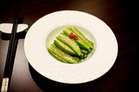Delicious Chinese Okra dish on white plate with chopsticks