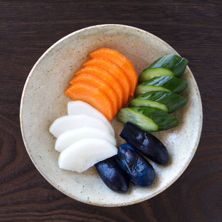 Traditional Japanese vegetable pickle , cucumber , carrot , radish , eggplant