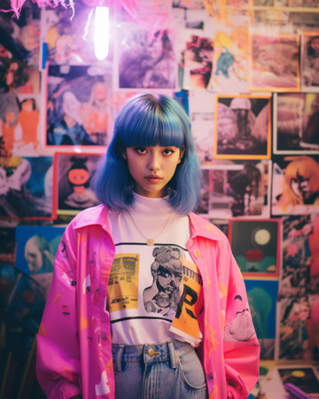 a woman with blue hair and a pink jacket standing in front of a wall of posters