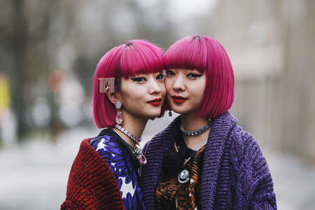 Paris, France - March 5, 2019: Street style outfit - Ami Suzuki, Aya Suzuki before a fashion show during Paris Fashion Week - PFWFW19