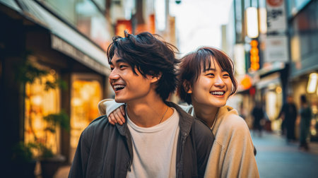 Young Asian adults laughing on the street at night.