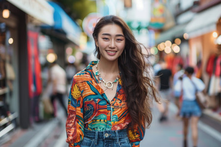 Stylish 20-year-old Japanese woman walking the streets of Shibuya, dressed in unique fashion, vibrant city life captured in the background.