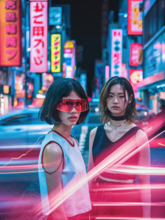 Two women standing in a city street with neon lights, AI