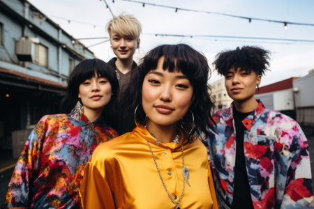 Group of young asian women with colorful hair standing in the city