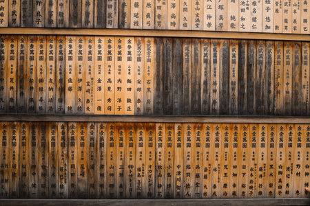 Rows Of Weathered Wooden Slats With Japanese Kanji Inscriptions At A Traditional Shrine