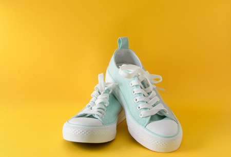 White fashionable sneakers and black suede shoes on a blue-yellow background. Top view.