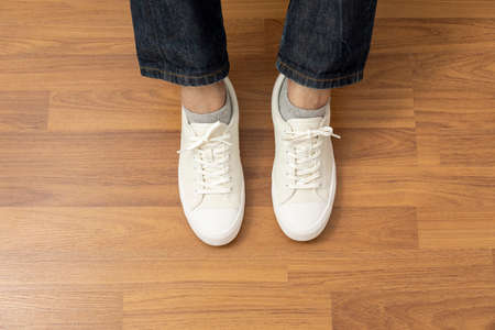 Close up of man's leg wearing brand new white sneaker shoe and blue jean sitting on wood floor.