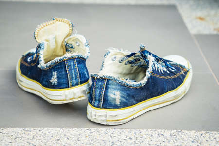 Children's sneakers on an old wooden surface. Sports worn shoes
