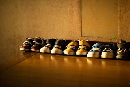 A neat row of various shoes and slippers lined up on a wooden floor near a doorway, bathed in warm sunlight. The perspective is low, highlighting the organization and the concept of entering a home.