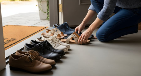 A person is kneeling on the floor arranging a neat row of various shoes near an open doorway. The collection includes sandals, sneakers, and dress shoes lined up on a doormat, indicating organization and household cleanliness.