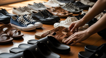 A person's hands are arranging a collection of different shoes including sandals, boots, and sneakers in a neat row on a wooden floor. The image highlights footwear organization and variety, suggesting preparation for travel or seasonal cleaning.