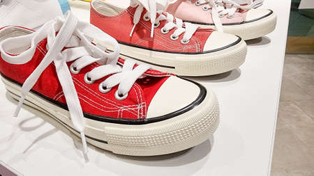 Many colorf pairs of shoes on display at a mall.Fashionable shoes on the store shelves.Sneakers for sale at shopping mall. spring summer fashion concept