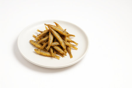 Neat pile of crispy fried small anchovy fish in center of simple round white ceramic plate on clean white studio background