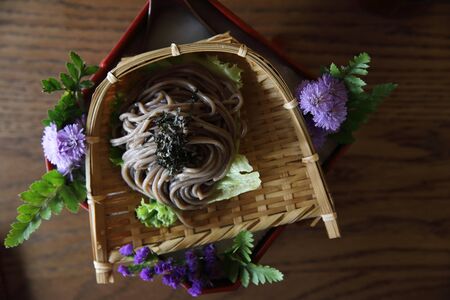 Traditional Japanese meal with cold soba noodles on a sieve bamboo tray