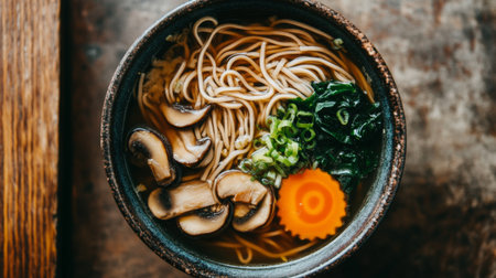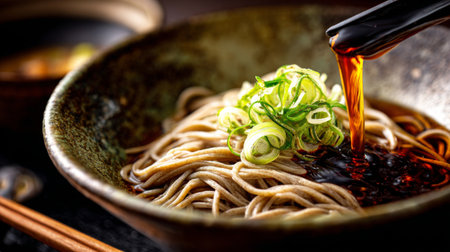 Traditional Japanese food style. Selective focus. Copy space. Bowl of Asian style soup with green tea soba noodles on wooden table.